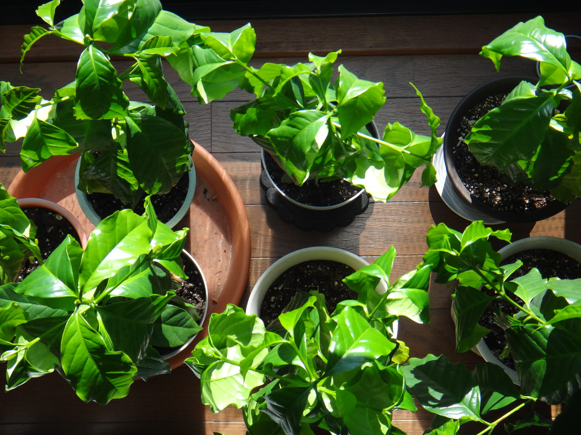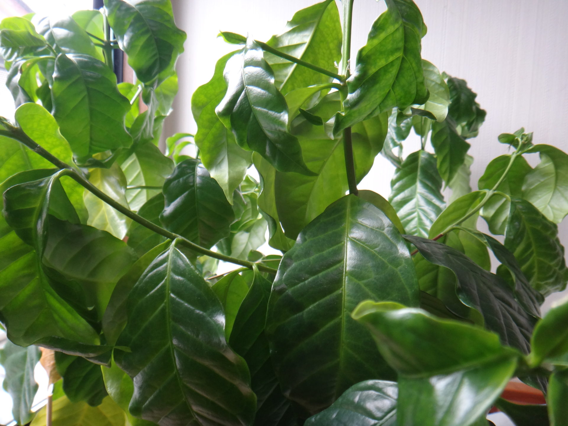 1月28日、曇り空から冷たい雨が降り震える寒さの一日でした。盆地を取り囲む周囲の山々では雪になっている事でしょう。そんな環境下、南国育ちのコーヒーにとって日本で冬を過ごすのは大変なことです。温度管理は当たり前、水やり過多と日照不足による根腐れの管理に細心の注意を払います。特に難しい理由は成長のペースが不揃いなため、管理の方法もタイミングもバラバラに行います。だから失敗もあり、都度ハラハラドキドキの連続です。それでも基本コーヒーはとても強い植物だと思います。温度管理さえキープしていれば多少のミスは許容してくれるので助かります。水やりに関しては乾燥気味の方が好まれるようで、葉の状態を見て少なめに与えています。今日は成長レースのトップグループの写真を撮りました。現在のトップは8月10日に植え替えたD君で当時は4番でした。側枝が両手を大きく広げて激しいバトルを戦っているように見えます。