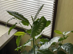 1月20日「大寒」、1年で最も寒い頃とされていますが朝の最低気温はプラス3℃でした。さらに昼間は14℃まで上がり、日差しには春を思わせる柔らかさがありました。コーヒーが過ごす温室状態の部屋もエアコンOFFで大丈夫です。このまま春になるとは思えませんがコーヒーにとっては過酷な冬が無事に越せることを願っています。生育が悪いポット原因は中央がサビ病、左右は植替えが未実施だからです。