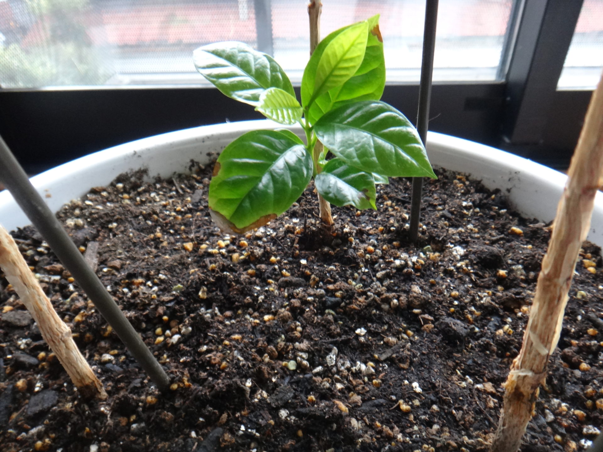 10月17日、昨日までの残暑が嘘のように気温が急降下、等圧線は縦縞で典型的な冬型の気圧配置になりました。早朝の冷たい雨は9時頃には止みましたが、その後の北西風に冬の到来を感じた一日でした。さて心配なコーヒーの子供たちですが、生育停滞期のまま変化がない状態が続いていました。恐らく気温がダラダラと変化なく季節を感じなかったからでしょう。だから今日の急降下でスイッチが入る事を期待したいと思います。今日は一月遅れの植替え作業を行いました。用意した鉢は10号サイズで成長が一番の双子ちゃんには寄せ植えは狭いので、中位の3兄弟を選び均等な間隔に並べて植替えました。ポイントは水はけを良くする赤玉を5cm敷いて、土も観葉植物用の少し上等な物を使いました。ただ急激に寒くなって心配なので、今日はこの3兄弟だけで他は様子見とします。