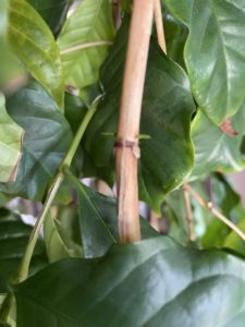 10月21日、今季一番の冷え込みを観測した昨日に続き、今日も最低気温は7℃台まで下がりました。ここから日中の最高気温は20℃を超え、激しい寒暖差に体調管理も大変です。これからの季節、気温の低下と共にコーヒーが美味しい季節を迎え、コーヒー屋は繁忙期に入ります。さて毎日欠かさず観察しているコーヒーの子供たちですが、今日はその中の1本に面白い発見がありました。地表からの高さ38cm、幹の途中に若葉色の一対のヒゲ(長さ5mm)を見つけました。幹の節目の直ぐ上なので、位置的に側枝の芽と思われますが、ここから葉が出るのか、それとも枝が伸びるのか楽しみです。