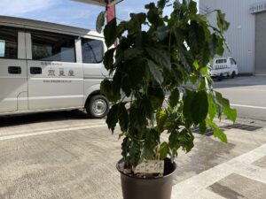 11月4日、3連休の中日は午後から雲が広がりましたが、爽やかで穏やかな一日でした。ここ数日は昼には夏日になっても朝は一桁の気温に下がり、極端な温度差があって驚きです。このためコーヒーの子供たちは3階の事務所に移動しています。店が寂しいので一番元気なポットを店頭に置いています。店内は午後からは日差しが入らないので、午前中は駐車場に置いて朝日を浴びて光合成です。11月とは思えない陽気に植物は人間以上に敏感になっているようです。