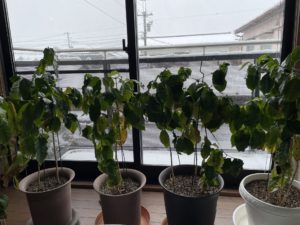 2月10日、南岸低気圧の通過と寒気の影響で予報通り明け方から雪が降りました。コーヒーの子供たちにとって、生まれて初めて見る本格的な雪です。目測で10cmの積雪がありました。当然、最高気温は1℃前後で厳しい寒さの一日でした。今日の雪は、週間予報の早い段階から予想されていましたから、根にダメージを与えないよう水やりのタイミングをずらして来ました。ブラインドを全開にしても部屋を暖める日差しも、葉を傷める直射日光もありません。極端な寒暖差を避けるため、終日オイルヒータはONで室温10℃をキープします。明日は晴れの予報ですから、日差しで部屋を暖めて5日ぶりの水やりをします。
