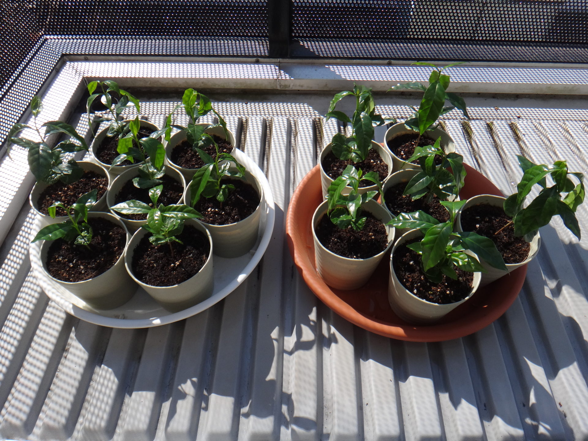 3月15日、3月に入って初めて氷点下の冷え込みになりました。昨日の雨が盆地を取り巻く山々では雪(清里で20cmの積雪)になり、良く晴れた今朝は標高1000m以上に砂糖を塗したような美しい景色が広がりました。幸い風が出なかったので寒さは感じられません。むしろ柔らかい日差しが心地よく、テレビや新聞を見ない限り、悩ましいコロナウイルスを忘れさせてくれる平和な春の一日でした。順調に生育している13ポットのコーヒーにも癒されます。そんな今日は余りにうららかな陽気なので、思い切って幼い苗たちを、初めて屋外に出して外気と春の陽光に当てることにしました。場所は日当たりの良い南向きのベランダです。その前にたっぷりの水やりが大切です。乾いた空気に当たって急激に乾燥するからです。写真は水やり直後で葉が少し下向きですが、3時間後に出先から戻ると元気な姿に戻り、日が陰った13時に屋内に取り込みました。