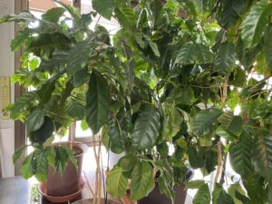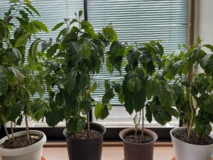 3月16日、東京と横浜からは早くも桜開花の便りが届いております。甲府でも連日20℃位で、18日が開花の予想日なっています。今日も最高気温は22℃まで上がり、4月下旬の陽気です。コーヒーの子供たちが過ごしている2階の部屋は日当たりが良いため、ブラインドで遮光して室温の過剰な上昇を抑えています。水やりも2~3日に1回たっぷりと与えます。気温の上昇と共に成長の早いポットはご覧の通り、コーヒーの森が広がっています。来月には剪定作業を開始する予定です。