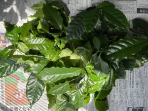 4月13日、13時の気温は21℃湿度25%で乾燥注意報が発令されています。甲府では黄砂の影響は少なく青空に富士山の雪が映えています。コーヒーの子供たちは旺盛な成長を見せていますが、伸び放題の側枝が気になります。そこで今日は予定どおり剪定作業を行いました。青々とした新緑の若葉をカットするのは勇気がいります。観葉植物としてのコーヒーの最大の魅力が葉の鮮やかなグリーンにあるからです。それでも心を鬼にして大胆に剪定?伐採?しました。樹を太らせ樹形を整えるためです。画像はカットした大量の若葉です。