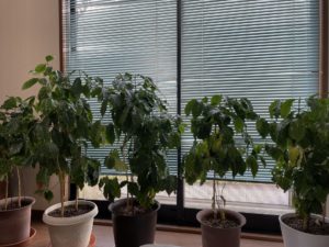 4月20日、甲府の最高気温は27.8℃と昨日に続き夏日になりました。昨年も夏が早かった印象がありましたが、今年は一段と早く季節が進んでいます。街路樹の緑も完全に夏の色になっています。コーヒーの子供たちは一週間前に大胆に剪定をしたので枝葉はサッパリしています。気温の上昇にともない水やりの頻度も増え、合わせて緩効性の肥料も少量だけ与えます。さて樹形は思うような形に出来るでしょうか。連休明けには店頭に並べる予定です。
