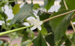 4月2日、早朝は少し冷えましたが、各地で真夏日に迫る暑さを観測した日曜日から季節は一気に春本番に突入しました。2月20日の異常な高温から一転して2月下旬から寒い日が続いていました。このためコーヒーの花は2輪咲いたのみ、他の花芽は堅いまま眠っていました。それが40日振りに今朝、3輪目が開花しました。花は小振りですが香りは強く、一輪で部屋中に甘い香りが充満していました。これから11月までが生育期となります。次の開花が楽しみです。