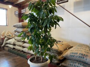 4月12日、朝から快晴の青空が広がり雪の南アルプスが美しく映えています。気温も11時前に20℃を超えました。まさに春爛漫、コーヒーの子供たちも嬉しそうにしています。花芽を付けたポットはまだ開花には至りませんが、毎日の観察が楽しみです。その中で今日は一番成長の早いポットを2階の温室から1階の店に下ろしました。すっかり背丈の伸びた3本の寄せ植えで、床に置いてみるとかなりの存在感があります。他のポットも順次下ろす予定です。
