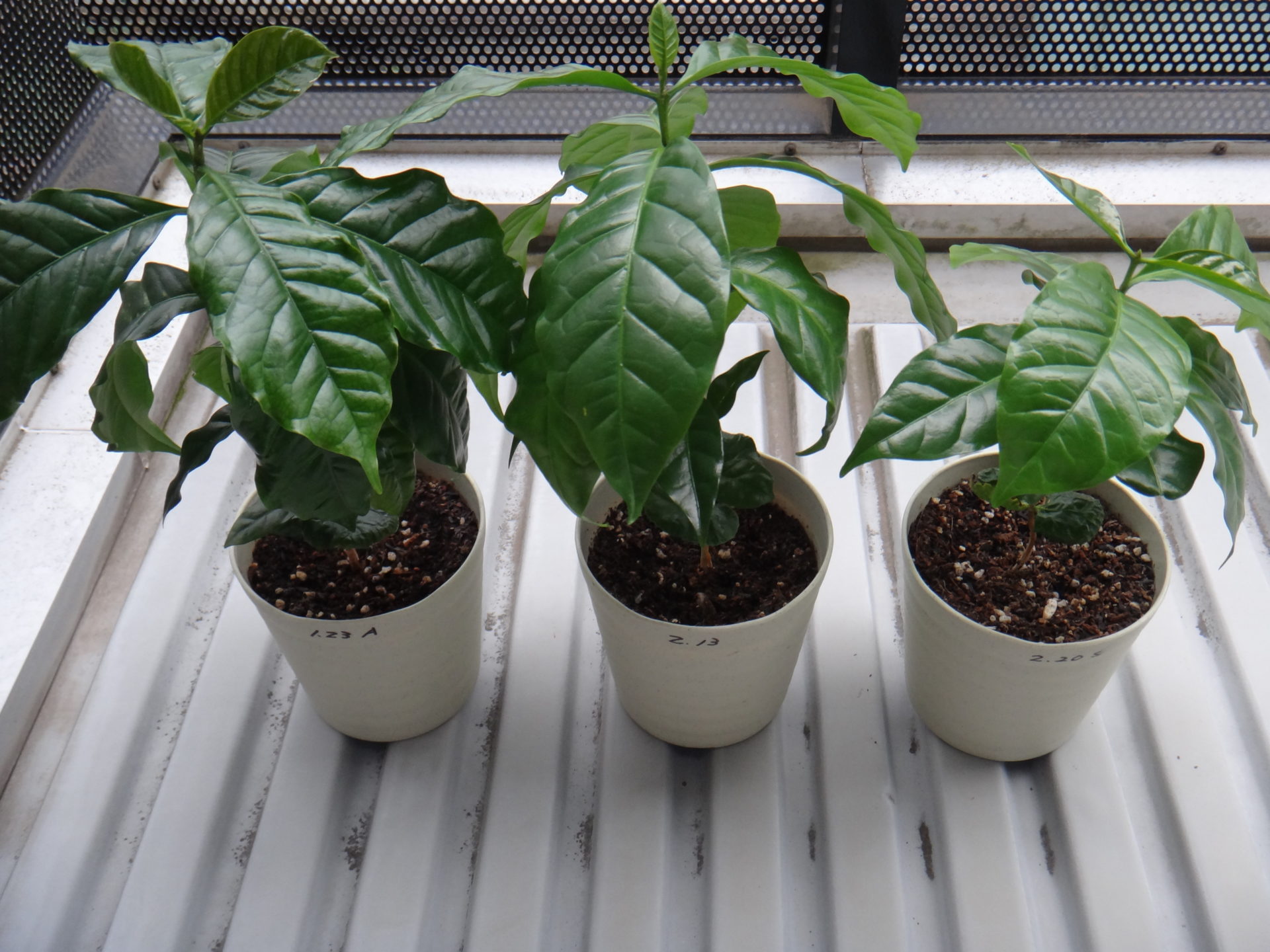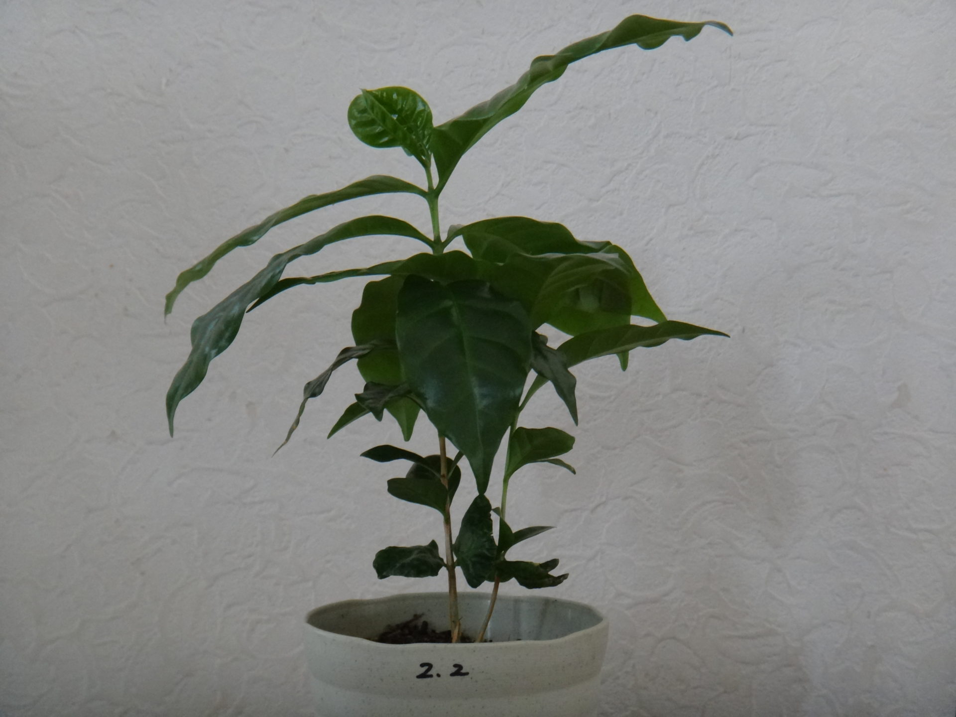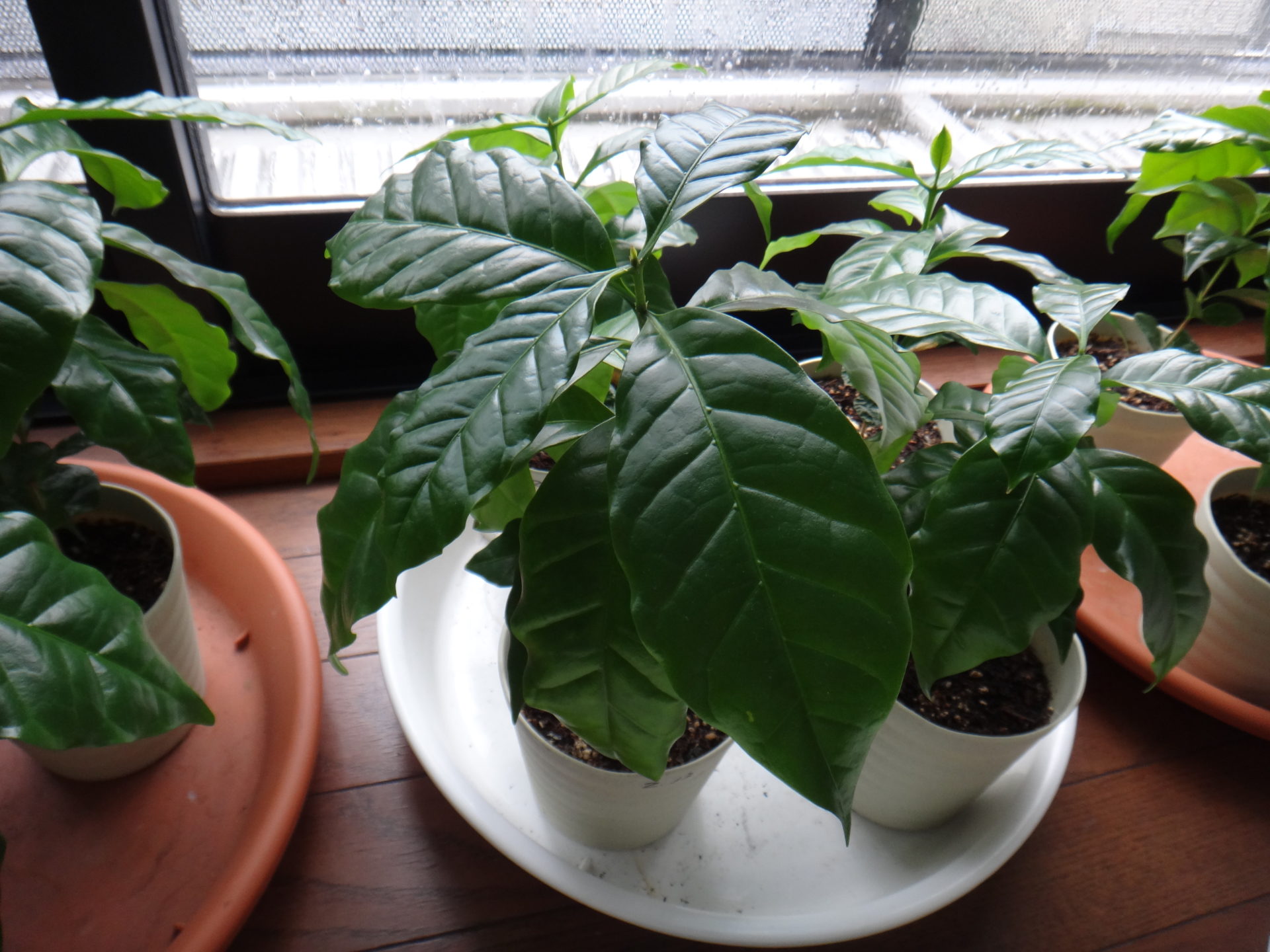 6月4日、甲府では3日連続の真夏日となりました。それでも湿度が低く、午後からは風も出て、日影で過ごせば不快な暑さは感じられません。人間にとって快適な気候はコーヒーの子供たちにも良好な環境と言えるようです。観葉植物としても人気があるコーヒーの一番の魅力であるグリーンが一段と鮮やかに映える季節です。さて今日は末っ子と共に気に掛けている双子ちゃんの様子を観察してみます。大きい方の樹高は約20cm、小さい方は約12cmに成長してきました。本葉の数も16枚、12枚とかなり密集していますが、葉の色で判断する健康状態に問題はありません。また他の兄弟たちと同様に幹の根本がしっかりして来て爪楊枝3本分ほどの太さになりました。こうなると更に大きくなれと思うのが親心ですが、過保護による肥料の与え過ぎは厳禁です。液体肥料を1000倍に薄めた物を10日に1回程度で十分です。普段は土の表面が完全に乾いてから鉢底から流れ出るまで水をあたえます。これが強い根を育む秘訣なのです。