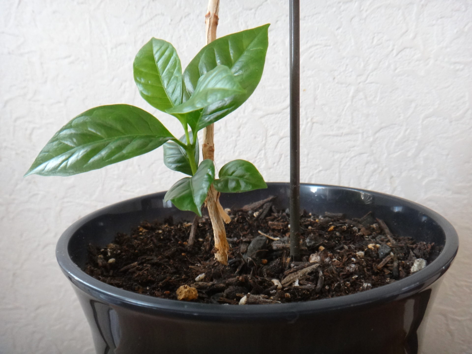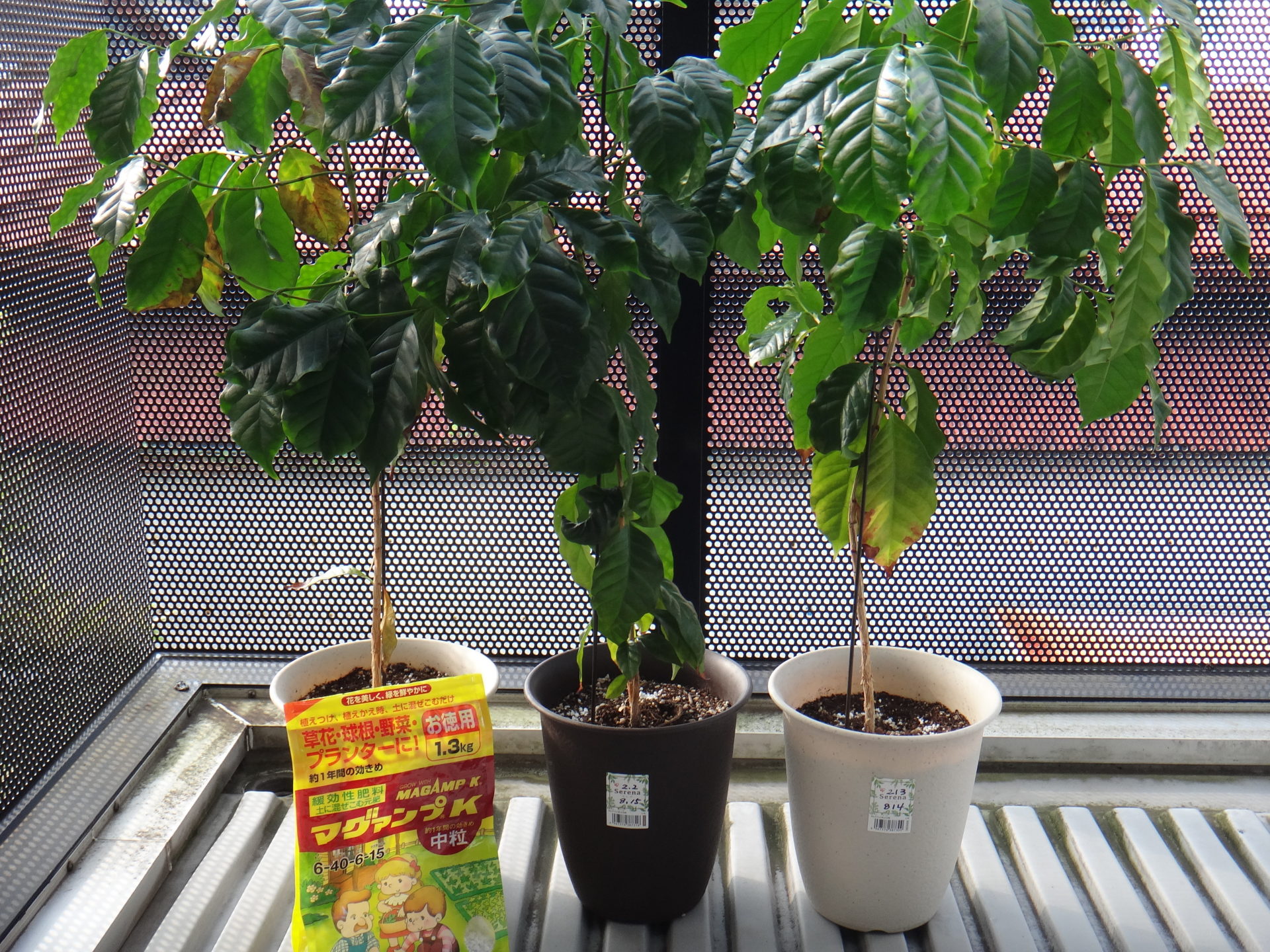 9月25日、朝晩は涼しくても日中は毎日30℃の残暑さが続いています。相変わらず生育停滞期から覚めないコーヒーの子供たちに緩効性の肥料を与えました。そして来月に植替えを予定している3ポット(中央が双子ちゃん、左下が化成肥料)をベランダに出して、6時から30分間だけ早朝の自然光に当てました。朝は爽やかで日差しも優しいと勘違いしそうですが、油断大敵です。人間には気持ちいい朝の日差しもコーヒーには大変危険な存在です。直ぐに葉焼けを起こします。現地の農園ではバナナ等をシェードツリーとして一緒に植え、直射日光からコーヒーを守っています。