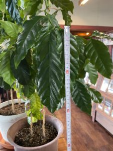 9月7日、台風11号は北方に抜けましたが列島には前線の先に連なる雲が残り、はっきりしない天気が続いています。県内も曇り、昼頃から雨が降り出す予報で、この先の週間予報にも傘マークが並んでいます。さて店頭に並べたコーヒーの子供たちですが、観察の機会が増えたことで不思議な発見がありました。写真の巨大な葉っぱ(長さ20cm以上)です。標準的な葉の倍近くのサイズがあります。その理由を探ってみました。一番に考えられるのは、身長を抑えるため芯止めした直ぐ脇から伸びた側枝だからと思います。幹から3節目の葉で、コーヒーの強靱な生命力に喜びを感じます。でも本当はこの養分で幹を太らせ、根も強く逞しく、と都合の良い願望を抱いています。
