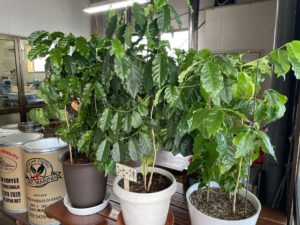 9月14日、9月も半ばにして最高気温34.5℃と猛暑日に迫りました。湿った気流の影響で湿度も高く不快な一日でした。そんな暑い日が続く甲府盆地ですが、今日は自宅に残した最後のポットを店に移送しました。さすがにテーブルに5個のポットを並べると少し窮屈な感じです。それでも12本のコーヒーが店の入り口に並ぶと存在感があるようです。お客様から色々とお言葉を頂き、ご注文のコーヒーのパックを待つ間にコーヒー談義が生まれます。最初の花が咲くまで5年位かかり、1本の木から一年間に収穫されるコーヒー豆は250g程度と知ると皆さん大変に驚かれます。また、温暖化による異常気象(干ばつ、降霜など)の影響で収穫量が大きく減少することがあります。植物(作物)を育てる大変さが身をもって感じられます。
