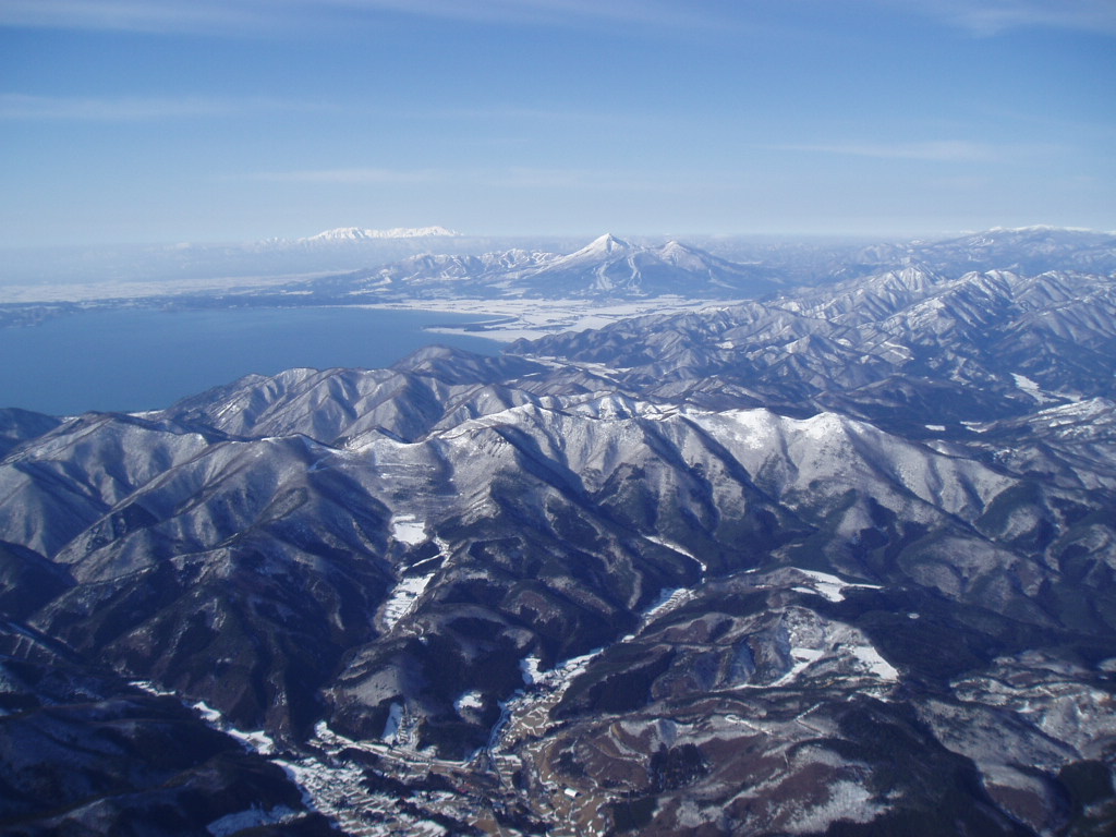 福島13:40~双葉15:45 2+05厳冬期には珍しく1028hpの高気圧に広く覆われて、気流も穏やかなので帰路は日本を代表する風光明媚な、景勝地を巡る山岳ルートを計画しよう。だが猪苗代湖がAREA2、那須塩原~日光~赤城山~榛名山~浅間山までがAREA3(航空自衛隊の訓練空域)の中に有る為、規定高度の範囲内での飛行には事前の許可が必要になる。フライトプラン提出の為に航空局に相談した所、昼食を中断して30分も自衛隊との調整に当ってくれた福島空港の親切な情報官の対応で今日のルートプランがファイルされた。写真は、郡山から猪苗代湖に向かう右席(高度2100m)から、北岸に尖っているのが宝の山と唄われる磐梯山(1819m)、今は歌のイメージとは違う、雪と氷のモノトーンが遥か飯豊連峰まで続く。