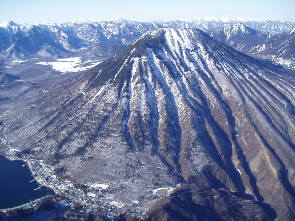 平日には戦闘機が高速で飛び交う猪苗代湖の上空だが、今日はコールド(専門用語でホットが訓練中)を確認しているので、 「広さは諏訪湖の5倍はあるね」 などと話しながら、湖上をゆっくり旋回してから巡航高度2500mで、南に見える那須の三本槍岳を目指す。今日の同乗者はグライダー歴40年のベテラン教官、気流も静穏で視界を妨げる雲も無く、安心感からか眠気を感じてヒーターを切る。 しばらくして、GPSの画面がAREA3への進入注意を知らせてくれるが、正規の手続きが取って有るので躊躇せずに、左に鬼怒川温泉を見ながら空域の中央を縦断して行く。写真は、日光国立公園の核心部で中禅寺湖の北岸に位置する男体山の東側を山頂(2484m)とほぼ同高度で通過する右席から撮影。その名の通り重量感の有る山容だが、山肌はなぜかフリルのスカートの様に見えた。空の散歩に御招待2006-01-22
