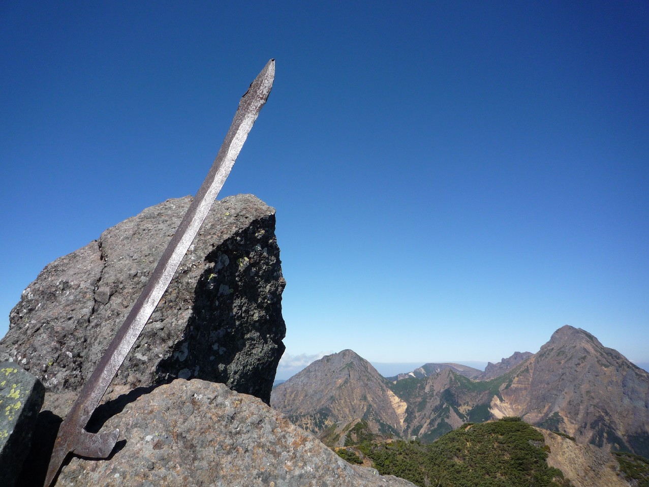写真は快晴の秋空に突き立つ権現岳山頂(2715m)に祀られている鉄剣(長さ3m近い)と、一望に見渡せる八ヶ岳の名峰群(右が最高峰の赤岳2899m)。