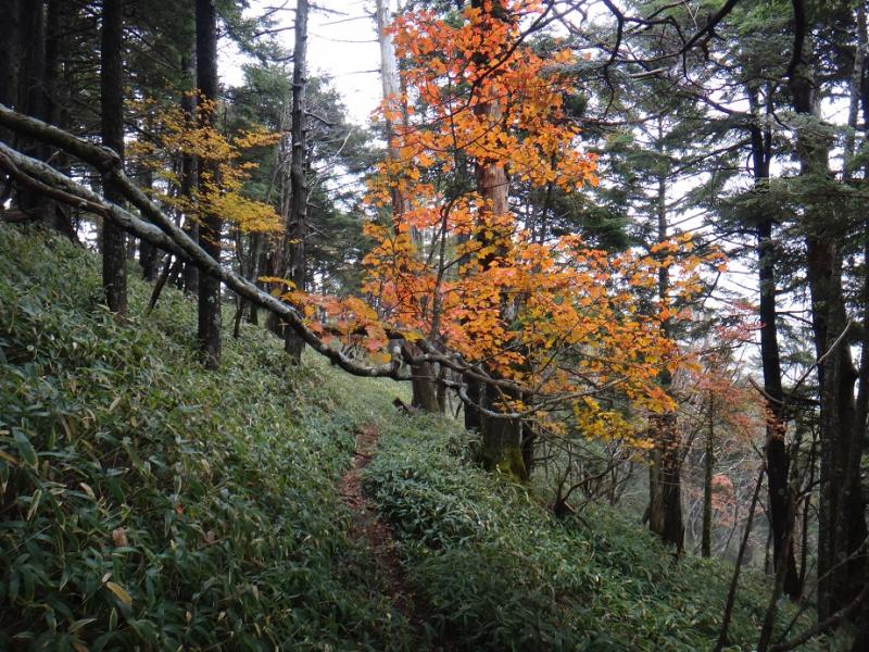 今日はクラブのY君と今年のメイン山行に計画していた奈良田から直登する笹山ダイレクトルートに挑戦する予定だったが天気がすっきりしない。気象庁のHPによると南アルプスは甲斐駒から聖まで全域が曇りの予報、標高差1900mの厳しい鉄砲登りを頑張っても山頂からの眺望が無ければ達成感も半減、いや得られない。県内では唯一大菩薩エリアが曇りのち晴れの予報なので、笠取山から唐松尾山に変更した。登山口の作場平橋へは前回の記憶より距離があり、自宅から2時間を経過した6時50分に到着する。直ぐに出発する。二人とも笹山モードで準備していたのでペースが早い。過剰とも言えるほど良く整備された道を笠取山まで2時間弱で登ってしまう。問題はこれから先で極端に路面が悪くなり露出した木の根が雨に濡れてすべり、倒木が何ヶ所も道を塞いでいる。何より道が細い。東京に勤務していた若い頃に奥多摩から2泊3日で縦走した記憶が薄れるように、この縦走路も歩く人が減って薄れて行くようで寂しい。青空は無かったが山頂から将監峠方面へ少し下った2000m付近(写真)で道に倒れ掛かったもみじの紅葉が美しい。