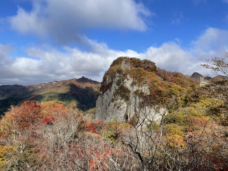 山の会では10月も多くの例会山行が企画された。その中から西上州の立岩(1265m)にエントリーした。場所はクレヨンしんちゃんで有名になった荒船山の南に位置して、名前の通り岩山が林立する中級者向けのマイナーな山域にある。さらに登山口までのアプローチが約100kmと遠いこともあり参加者は少なく、6名で5時に韮崎を出発した。天気は曇りから回復に向かう。7時に登山口がある線ヶ滝駐車場に着くと4台の先客でスペースの半分が埋まっている。スタートして沢を渡ると急坂が始まりグングン高度を稼ぐ。やがて正面に黒い岩壁が現れる。これを巻き気味に左の急峻なルンゼを這い上がる。次の高さ15mほどの垂壁をトラバース気味に登る所には頑強なクサリが設置されている。美しい紅葉を楽しみながら東峰と西峰のコルに着く。ここでハーネスを着けて東立岩を目指す。小さなアップダウンが連続し、危険な所はスリングを巻いて通過する。たどり着いた山頂は狭く6人で満員になる。360度の展望が広がり、これから向かう主峰の西立岩の全貌(写真)を望む。帰路に立ち寄った滝の裏側に祀られた威怒牟畿不動など変化に富んだ山旅を満喫した。 TX線ヶ滝07:20~西立岩09:45 2+25(東立岩)