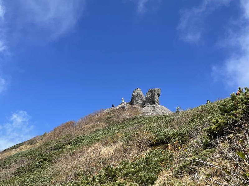 昨年9月に登った天女山から権現岳に今年も登ってみた。八ヶ岳に数ある登山コースの中でも比較的ロングコースで歩き応えがある。天気は高気圧に覆われて快晴が約束され、登山口駐車場はマイクロバスなどで7割と賑わう。八ヶ岳登山こだわりのGO GOGO5時55分にスタートする。直ぐの天ノ河原の展望台から東にご来光を見る。今日の目標タイムはCTの8掛け230分と控えめにする。前半の前三ッ頭までは変化に乏しい単調な道が続く。先行する若者グループを何組も追い越して、朝露に濡れたクマザサの露払いを買って出る。余りに調子が良いので15年前の記録205分を狙いギアを上げた。ところが直後に左ふくらはぎに痛みが出た。こむら返りが起こりそうな症状に立ち止る。しばらく治まっていたから油断していた。痛みに耐え小まめに水を飲みながら頑張っていたら、山頂の岩峰が何時ものピースサイン(写真)で迎えてくれた。天女山05:55~権現岳09:55 4+00