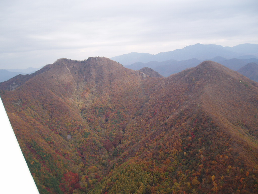 山に親しむ者なら誰も、この時期は紅葉が気掛かりだろう。晴れの得意日 「文化の日」 なのだが、気圧の谷の影響で午後からは雨になりそうだ。躊躇して朝のスタートが遅れる、こんな日は手っとり早く愛馬で駆け上がって仕舞え!歩きなら2時間は掛かる茅ヶ岳も、離陸から5分程で頂上に着く。天気が崩れる前の気流は静穏で、山肌への接近もリスクが小さいから、パワーを絞り、フラップも一段下ろして、ゆったりと紅葉を楽しみながら飛ぶ。写真は、高度1650メートルからの茅ヶ岳を南西側から、背後に金峰山の五丈岩が見える。紅葉は今が見頃なのだが、青い空と明るい日差しが欲しい。双葉10:30~双葉11:30 1+00