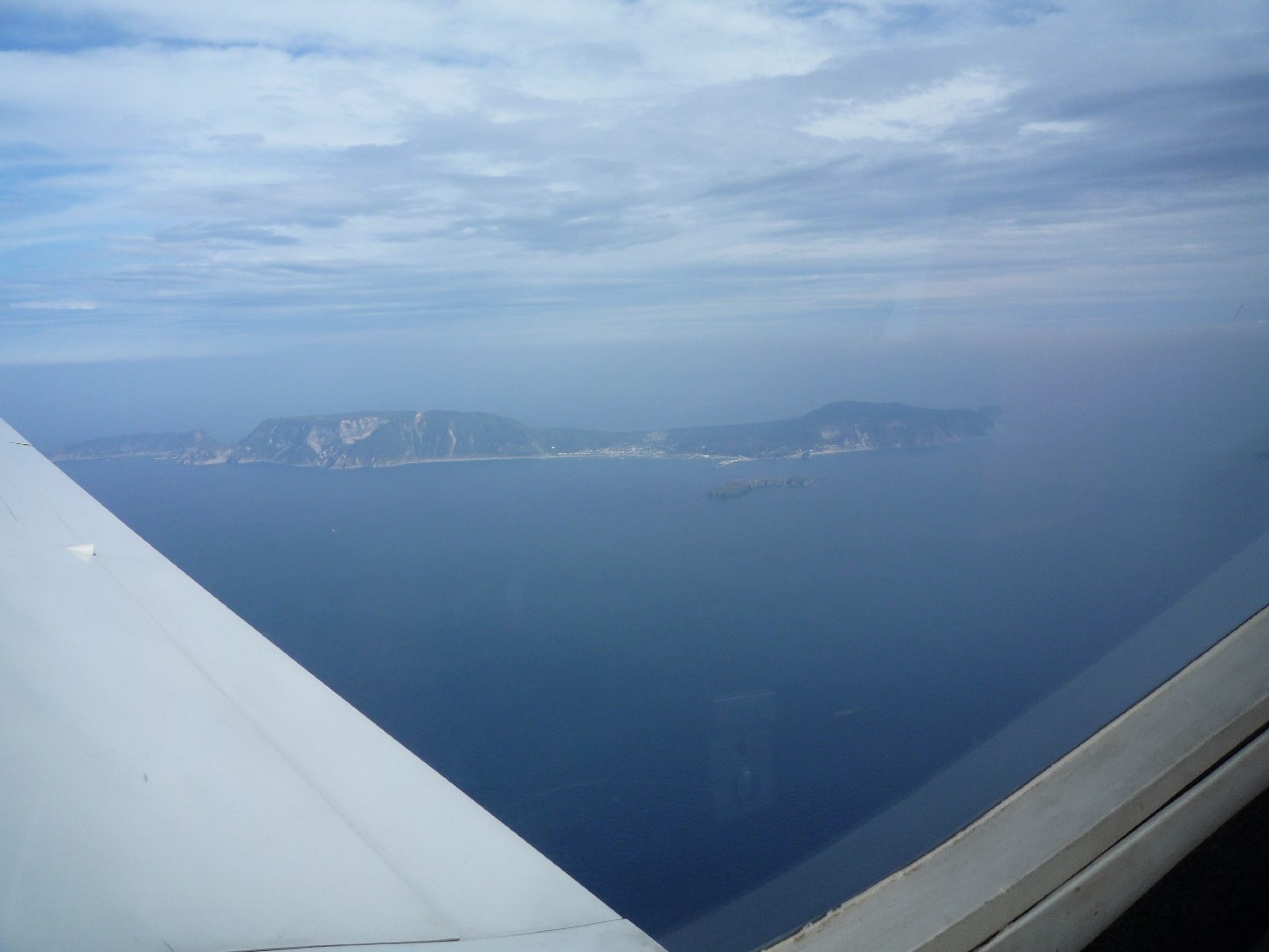 写真は、帰路R/W29を離陸して新島を振り返る。周囲42km南北に細長い島で中央の僅かな平地に空港と村の中心部がある。
