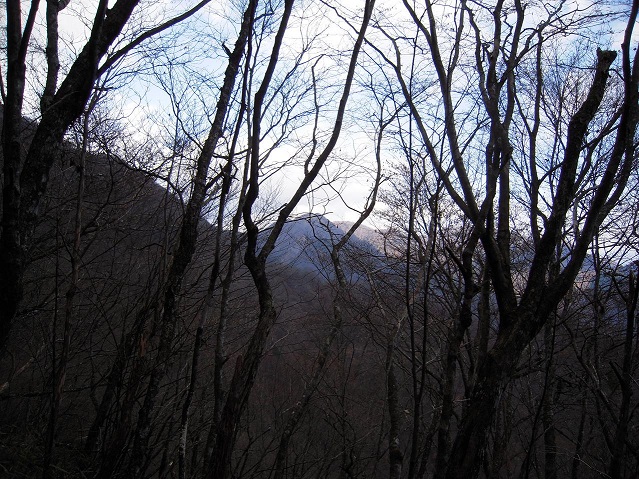 13時、山頂まで1.8km 地点で中止を決める。木々越しに十枚山の稜線と山頂(写真)が見える。車に戻る頃には本降りの雨になった。