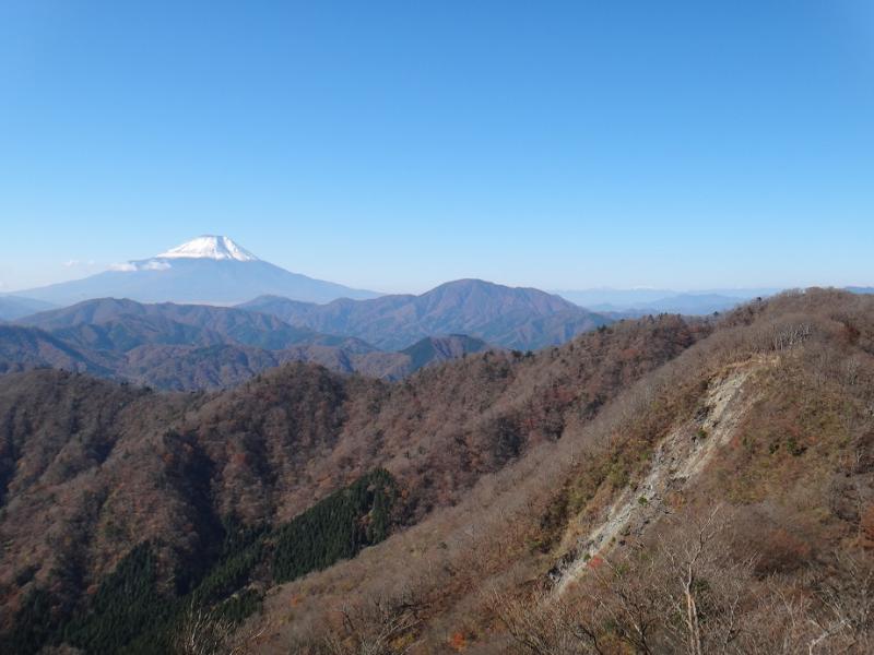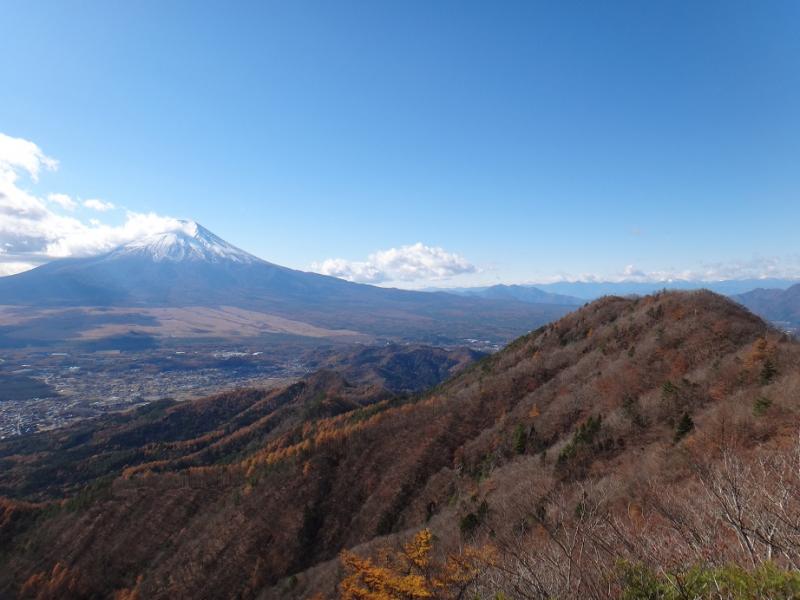 還暦を迎えた2015年に健康と体力維持の為に「年間20日の登山」を目標に掲げた。15年は22日、16年も22日と目標を達成できたが、今年は隔週で日曜日を営業にした事と、8月と10月に長雨が続き思うように登れず、現時点でまだ13日と厳しい状況になっている。それでも11月に入って天候が安定して来たので挽回を期して頑張っている。今日は忍野村の鳥居地峠から杓子山(1598m)を経て鹿留山(1632m)をピストンする予定で出掛けた。河口湖の湖畔を迂回する新しい道路が開通して便利になり、天気も快晴で申し分なく順調に登山口に到着する頃に仕事の携帯が鳴った。計画は最短ルートに変更して、今来た道を戻り不動湯の林道終点から登る事にした。人気の杓子山も平日は静かで誰とも会わずにハイペースで登って行く。観光地の展望台のように俗っぽい杓子山の山頂は嫌いだ。休まずパスして鹿留山に向かう。振り返れば富士山が大きく、右下に山中湖も大きい。霜柱を踏む小さなアップダウンの稜線に、山歩きの喜びを感じる。途中の岩峰から越えてきた杓子山(写真)彼方に南アルプス南部も見える。ゲート08:45~杓子山09:55~鹿留山10:40 1+55