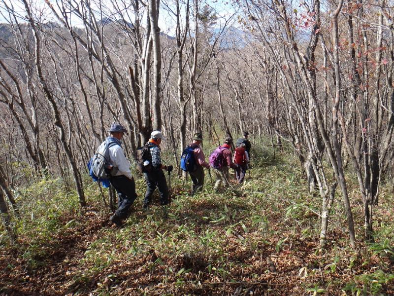 7月の暑い時期に登った御正体山は皇太子殿下も登られた名山であるが、生憎の天気で視界が無くクラブのメンバーには好印象を得られなかった。今日はその御正体山の魅力を再発見するため下山口だった道坂トンネルを登山口に、北へ今倉山(1470m)に登り、さらに東へ縦走コースを辿り菜畑山(1283m)までピストンした。トンネルの脇から急坂をスタートして尾根に出て右に曲れば御正体山を今日は左へ、標高差500mの落ち葉が積もる直登を頑張る。やがて背後の大きな御正体山の上に白く光る富士山が頭を見せ始める。登るに連れ富士山がますます大きくなり御正体山に向かい心で手を合わせる。程なくして三角点が立つ今倉山東峰に到着する。ここからは快適な縦走路の始まりだ。暑さ寒さも無い登山に理想的な好天と有ってアップダウンも鼻歌まじり軽快に越えて行く。やがて予定より少し早く本日の折り返し点、秋の陽射が眩しい菜畑山の山頂に到着した。何時もの楽しいランチタイムの後は、眼下に流れる道志川を挟んで西丹沢の山並みや、神奈川県の町並みなど眺望を楽しむ。名残惜しいが日が短い季節だから早めに後半戦にしよう。菜畑山から復路をスタート直後のメンバー7名(写真)お腹も満たして元気一杯!道坂隧道07:20~今倉山08:50~菜畑山10:50 3+30