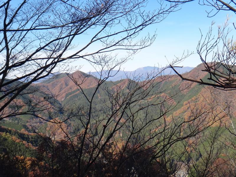 コースも終盤に差しかかり破風口の狭く小さなコルから大室山への最後の登りが、今日一番の急勾配になるが、特に急峻な場所には段差を小さく、踏みしろを広く作った木製の階段が設置され、遊歩道レベルの整備は過剰に思う。しかし道が良いと景色を眺める余裕があり、標高が上がると振り返る絶景が遠くまで見渡せる(写真)。中央には夏のクラブ山行で登った御正体山が大きく、その延長線に遥か南アルプス南部の雪の稜線が白く光る。今日は初めて訪ねる道志村へ大室山と鳥ノ胸山の計画で6時に自宅を出発し、双葉ETC~都留ICまで高速を飛ばす。7時半に登山口の駐車場に着く。県外車が2台、平日でも先行者が居るようで安堵する。山頂までのコースタイムは3時間、頑張って昼までに下りて午後は鳥ノ胸山の予定だ。単調な道をペースを上げて登り、白石峠から加入道山への尾根に着くと道の様子が一変する。丸木の階段が随所に現れ、非難小屋も木の香りが心地よい立派な造りで驚く。地図に目を凝らすと登山道は僅かに県境の東を通っている。県境を境に県の財政格差が山にも。次回は神奈川県側から登ってみよう。道志の湯07:40~大室山10:35 2+55