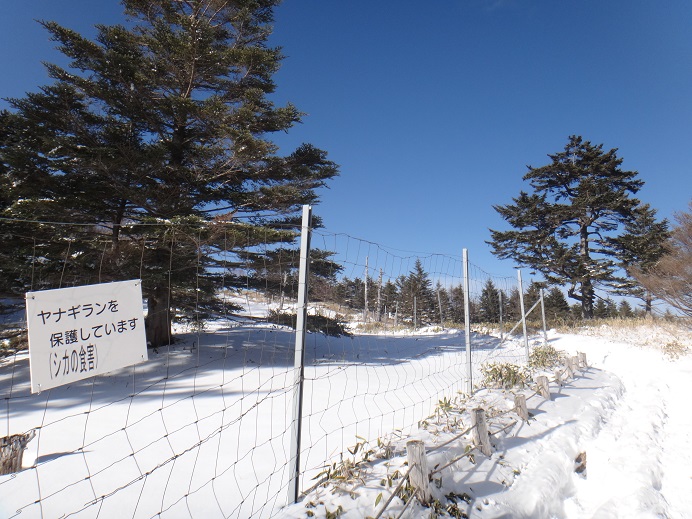 大菩薩で絶滅してしまったヤナギランを再生させようと懸命に取り組む只木さんに、静岡市の取り組みを紹介したNHKテレビの情報を伝えて3年が過ぎた。山梨と静岡の県境で安倍川山域の最高峰、山伏(やんぶし)は静岡県では唯一のヤナギランの群生地として有名で、大菩薩と同様にシカに食い荒らされ10株まで激減してしまった。それを静岡市がボランティアの協力を得て群生地をネットで囲み(写真)石灰で土壌改良を行い4年間で1500株のヤナギランを再生させた。3年前、只木さんに「俺が現地を見て来るよ」の軽口を思い出し2014年の最後に2014mの山伏を目指した。片道180km、県民の森を過ぎると雪道になり4時間のドライブを経て登山口に着いた。雪は予想以上だったが、風は弱く日差しには温もりが有り一汗かいて山頂に。日当りの良い南向きの草原、思ったより低く華奢な防護柵(ネット)、周辺の植生など、現地を見た感想を只木さんに報告しよう。百畳峠12:10~山伏13:05 0+55