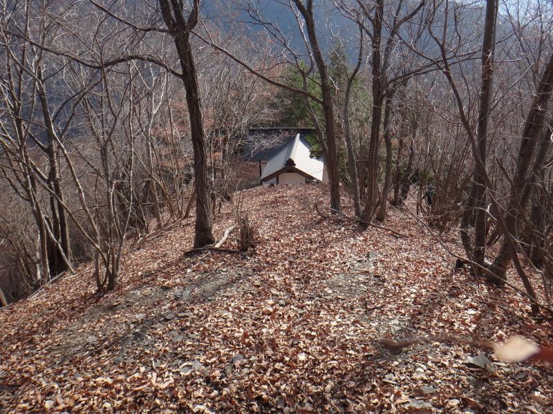 下山は本で紹介されている深沢集落へ下りよう。菱山林道まで戻ったら東へ200mほど、ガードレールが切れた所が下山口とある。富士山を正面に見るその場所には、切断した倒木に古い銀テープが巻いてある。微かな踏み後もあり間違えは無いだろう。前回の失敗を踏まえ今日は焦らず慎重に行こうと思う。先ずは地図をよく見て地形をしっかり頭に入れる。忘れずコンパスに方位をセットする。コースタイムは飯縄大神まで0:25、切りの良いジャスト13:00に下山を開始する。いきなり落ち葉が積もった急斜面で始まる。しばらくは道らしき物があったが、それも大量の落ち葉に埋もれてはっきりしない。三人とも落ち葉でスリップして派手に尻餅を突きながらの急な下り、だが足元ばかりに気を取られていてはだめだ。進路を示すピンクテープは一つも無い。やっと見つけたのは木に巻かれ、色も褪せた黄色のビニールテープだ。近づいてやっと気付くが、それでも有難くほっとする。途中1ヵ所だけ、相当に古い時代の半分朽ちた道標が木に付けられている。忘れた頃に黄色のテープ程度で踏み跡らしきは無い。それでも左右が顕著な沢地形だから、信じた尾根を忠実にトレースする。やがてS氏が神社の屋根(写真)を見つけ、緊張から解放され同時に達成感で満たされる。このコース、山岳信仰の時代に甲州高尾山への登拝路だったのか?調べてみたい。林道下山口13:00~飯縄大神13:30 0+30 TX