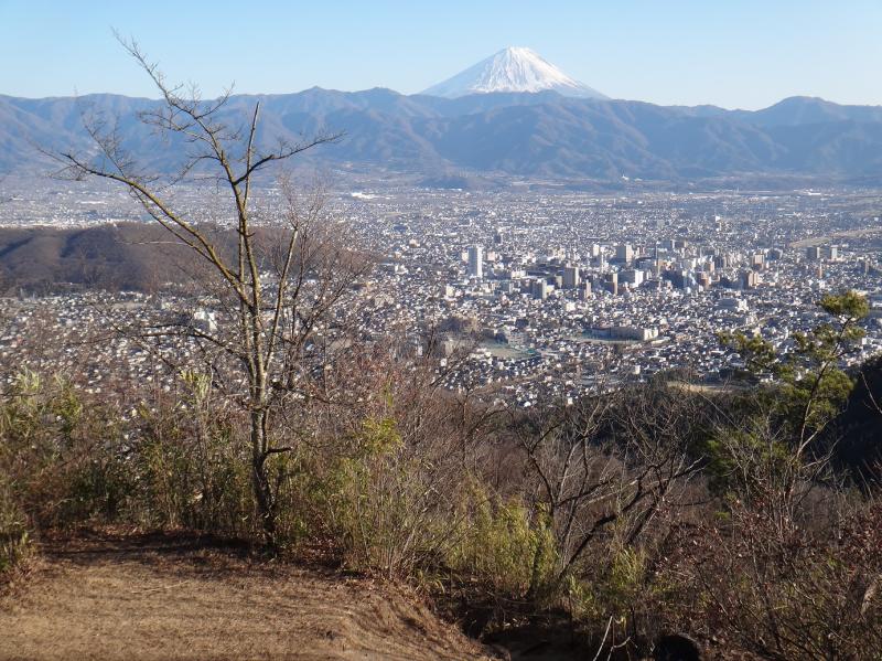 一昨年末から始めた週一の湯村山トレーニングが回を重ね14ヶ月で50回になった。先週は自宅を出た直後に雨が降り出してUターン、そのまま夜まで止まずにトレーニングは休みとなった。今日は一転して快晴の青空になったが、朝から猛烈な季節風が吹き、甲府で15時過ぎに瞬間17mを観測した。風は強くても「今日こそは」の思いを胸に、3時で仕事を切り上げて会社から緑ヶ丘に向かう。世間はコロナウイルスの影響か道路も、体育館の駐車場にも休日の賑わいが見られない。さあ気を取り直して行こう。しばらく晴天続きだったから路面は乾き、強風で落ち葉も飛んで歩きやすい。最初のチェックポイント湯村山12分、いったん下って法泉寺山に登り返して24分、ここから60mほど急降下して、右に鳥獣センターへの道を分けると本格的な登山道が始まる。稜線上は20mを超える烈風がゴーゴーと吹き荒れてバランスを崩しそうになる。第2東屋37分、ラストは風化花崗岩の白ザレが美しい道で高山の雰囲気が漂う。ここをBESTの3分で登れば目標の40分切りが見える。精一杯がんばったが結果は40秒オーバーで50回の節目に目標達成は叶わなかった。ただ、この強風コンディションでは上出来と言って良いだろう。白山(630m)から見下ろす甲府の中心市街地と、快晴の青空に富士山が美しい。緑ヶ丘15:20~白 山16:01 0+41(8℃ 40.40)