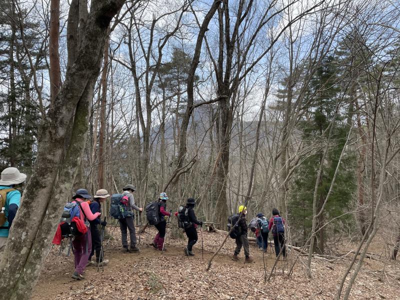 秋から冬の間は仕事が忙しく、昨年11月の天理岳から4ヶ月近く山に登れていない。今日は半ば強引に休んで山の会3月例会に参加した。総勢14名で秀麗富嶽十二景の扇山と百蔵山を繋げて歩く計画だ。この両山は過去に別々に登っているが、繋げて歩ける絶好のチャンスを逃したくなかった。信州峠ー飯盛山の交差縦走の時もそうだったが、グループ登山の利点で配車の問題はない。お陰で充実の稜線歩きが満喫できた。ただ気温が高目で空は春霞みに覆われ、富士山はその秀麗な姿を見せてくれなかった。特に長野から4時発で参加された2名は大変残念がっていた。それでも大勢は賑やかで楽しい。昼食にはAさん持参の山菜天ぷらが振舞われ、特にふきのとうは絶品でビールが飲みたいと声が上がった。写真はカンバノ頭を過ぎて、正面の樹間に見えた来た百蔵山を目指すメンバー。日々の雑多な仕事から離れ、久し振りに楽しい仲間たちと山に遊ぶ幸せな時間を過ごした。 TX梨ノ木平08:05~扇山10:00~百蔵山13:20~百蔵口14:50