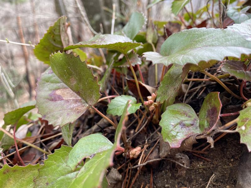 一週間後に計画されている笹子川源流バリエーションの最終回にエントリーするため体力トレーニングは休めない。ラジオ体操を終え緑ヶ丘に向かう。それが今年は早くから花粉症が始まって医者に貰った薬を飲みマスクでスタートする。湯村山13分、トレイルランナーが車道を下って行く。法泉寺山28分、呼吸が苦しくマスクを取る。コル34分、ヘッドバンドを着ける。ラジオを鳴らして背後からトレランの青年が迫り道を譲る。スリムな体形が瞬く間に駆け上がっていく。第2東屋46分、上着を取りラストスパートに入る。調子は悪くてもゴール60分切りは絶対に死守したい。八王子山51分、直下の白イワカガミは特徴的な赤紫の葉が元気に茂っていて今年も開花が楽しみだ。最終区間は7分を費やしたが、何とか60分切りは死守できた。・・・が、来週のバリエーションは行程8時間のロングコースになるので大丈夫か、今の体力で通用するのか、少々不安なエントリーになる。SM緑ヶ丘07:00~白 山07:58 0+58(6℃ 58.11.73)
