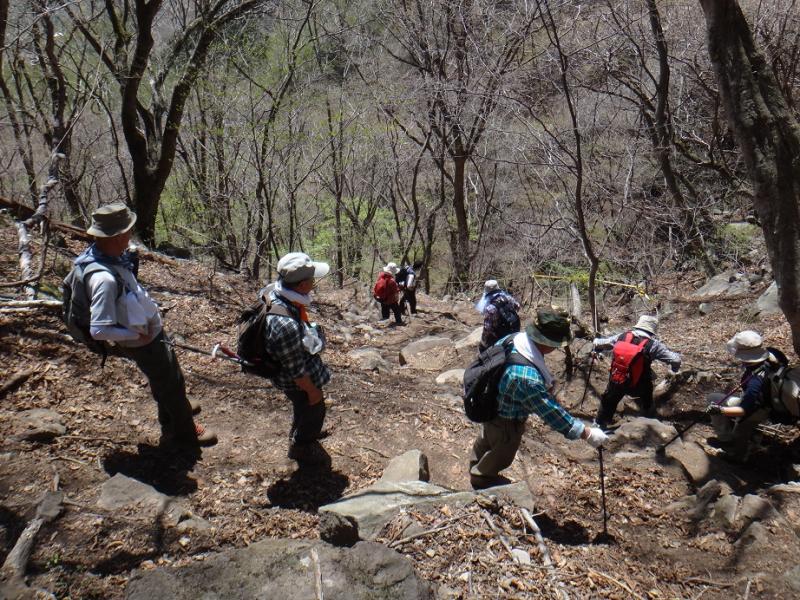 活動7年目になるハイキングクラブ、今年は原点に戻って自分たちが暮らす甲斐市の最高点であり毎日眺めている茅ヶ岳からスタートする事にした。本来なら一緒に出発したかったが、今年度は地区の消防リーダーを務める事になり、先週が雨で延期になった消防訓練に参加するためSリーダーとY君に先発隊を任せて、1時間遅れで一人後を追った。登山口の深田久弥記念公園までは車で15分、第一は満車で第二駐車場で身支度を整える。15分で林道を横断し防火帯の尾根を急ぐと大粒の汗が噴き出して来た。30分ほどしてトレランの青年が下ってきて聞くと5分ほどで直ぐに見える距離だと言う。程なくして100m先に最後尾のY君の白いシャツを視界に捉えるが、スタートからトップスピードで飛ばして来たからギアチェンジができない。急登で始まる防火帯の尾根も上部は傾斜が緩む場所が有り、広く平坦な所で大休止に入ったメンバーに追いついた。混雑する山頂を避けてKさんのオカリナでクラブのテーマソング富士山を大合唱する。毎回参加のSリーダーをはじめ20回以上参加が5名、10回以上参加が15名を数えクラブに大きな連帯感が出来上がった。来月は記念の30回登山を計画している。写真は女岩の上部を軽やかな足取りで下るメンバー総勢9名。ハシリドコロの群生地は満開だったが、ここまで下ってようやくブナの新芽が吹いていた。深田公園08:30~茅ヶ岳11:05 2+35(防火帯尾根)