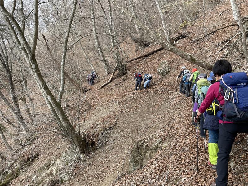 山の会4月の例会山行(富士見山)に総勢17名の一員として参加した。日記を調べると9年前の5月にクラブのY君と3+15で登っている。途中の長いトラバースが怖かった事、良く晴れて展望台からその名の通り残雪の富士山が美しかった事が印象に残っている。今日は幅広い年代層の大パーティなのでそれなりに時間が掛かった。それでも統制の取れた山岳会の山行は見事で、出発から途中のポイント、山頂そして下山まで全て計画と同タイムで遂行されたのには驚いた。リーダー、サブリーダーの的確な判断とメンバー全員の健脚がなせる業だった。個人的には少し物足りなく、下山コースの堂平分岐から北に続く稜線の先にある御殿山まで足を延ばしたい思いに駆られた。分岐での休憩時にリーダーの許可を得て少し偵察してみた。踏み跡は一気に薄くなるが、道が直角に左折する場所に南アルプスフロントトレイルの真新しい標柱が立ち、雰囲気の良い道が小さなアップダウンを交え続いている。写真は難所のトラバースを最後尾から、障害になる倒木を撤去する頼もしいメンバーもいる。 TX平須口07:00~富士見山11:20 4+20