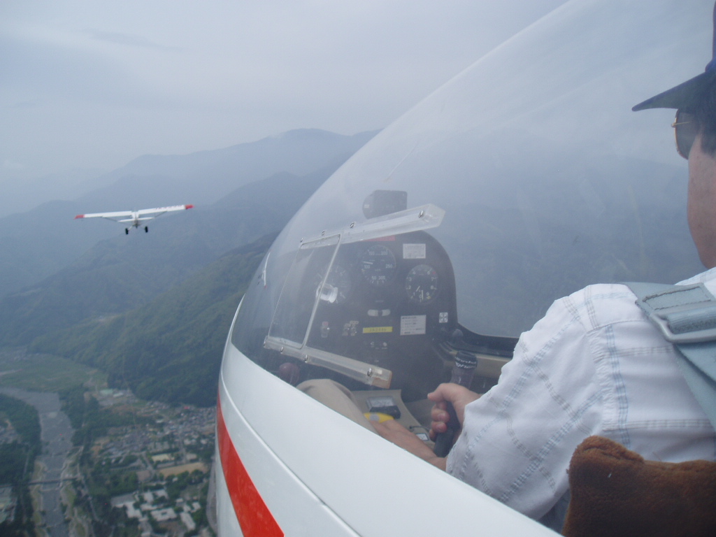 エンジンが無いグライダーは、曳航機に繋がれて空へ登って行く。対地高度が600メートルに達した所で、ロープを切り離して自らを大空に放つ。 長い翼が上昇気流を捕らえ、景色が大きくバンクして流れて行く。風を切って自由に大空を舞うグライダーを自在に操る時、人間は鳥になる。写真(後席の小窓から撮影)は、曳航ロープを切り離した瞬間。直後にグライダーは右へ上昇旋回、前方の曳航機は左へ急降下で降りて行く。計器板の一番右が高度計で海抜1000mを指している。眼下には御勅使川が見える。グライダーは4ヶ月振りだったので、複座機(二人乗り)の後席に訓練教官を乗せてチェックを受けた後、単座機(一人乗り)でフライトの予定だったが、天気の崩れに伴ないコンディションも悪く、安全を考え早めに撤収した。韮崎11:52~韮崎12:05 0+13