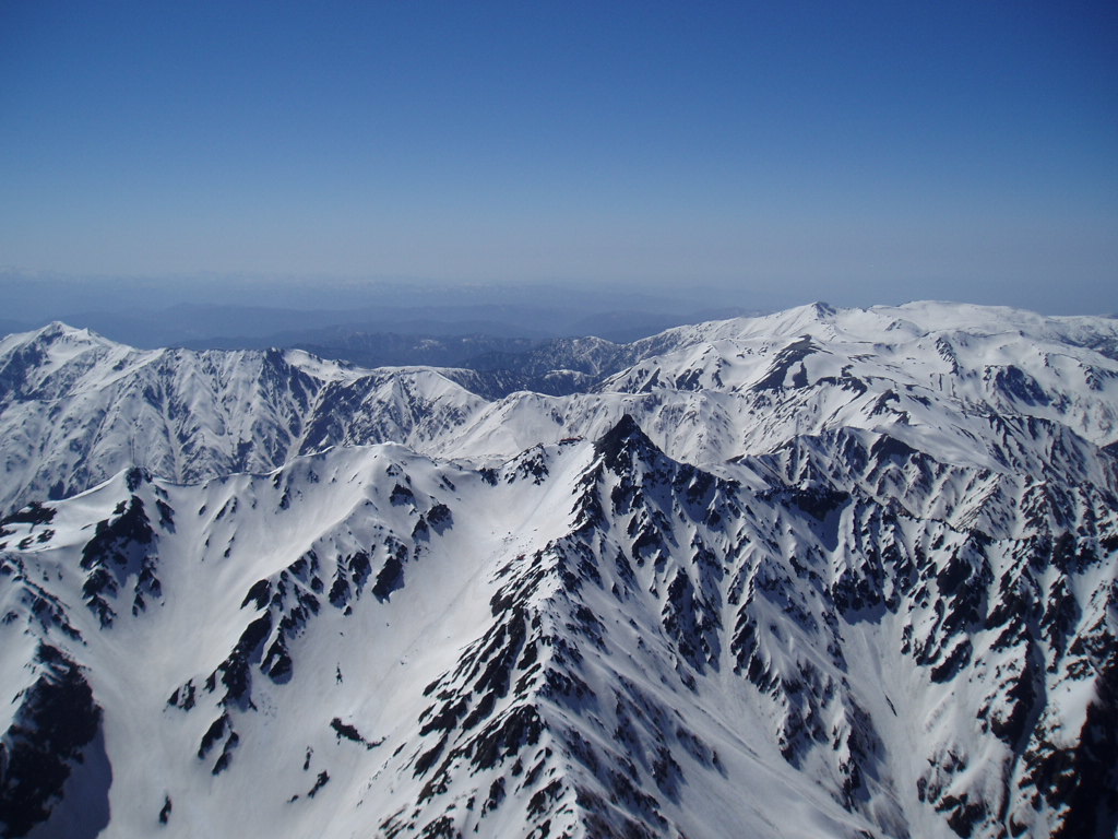 高気圧に広く覆われ快晴、松本~大町~糸魚川ルートで能登空港に向う。空はどこまでも青く気流も穏やかだから、帰りは久々のアルプス越えだ。 空港の気象事務所で入念なウエザーチェックの後、富山~飛騨高山~安房峠のルートプランで離陸する。地上の視程は30km位だが、能登島上空1000mからは、雲ひとつ無い青空に残雪の立山連峰が映える。さらに上昇すると大パノラマが広がり、富山湾上空2000mからは、御岳山や 乗鞍岳がよく見え、地文航法(地上の物標を確認しながら目的地を目指す)での著明な目標になる。飛騨高山からは針路を東に修正して谷間を登って行き、噴煙を吐く焼岳を対地高度150mで越え、さらに上昇しながら北アルプスの核心部に迫ると、3000m級の山々が幾重にも連なる荘厳な世界が、ここが正に日本の屋根だ。写真は、東鎌尾根上空3400mから中央に槍ヶ岳(3180m)、左肩の赤い屋根が槍岳山荘。背後には遠く日本海まで視界が広がる。双葉09:40~能登11:10 1+30