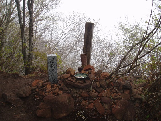 第三日曜は地域の清掃日で出発が遅れるが、深田記念公園が有る登山口まで車で15分、小雨の中(午後から晴れ予報)傘をさして歩き始める。直ぐに一般道と別れ防火帯の尾根道(分岐の道標も無く初めての人には分からない)に入る。道は山頂への最短の尾根で、急登に息が弾むが、人気の名山も裏道は静かで良い。ただ、地面は硬く滑りやすく下山ルートには不向き。1600m辺りで雨が強くなり、カッパを忘れた事を悔やむ。 くたびれた登山靴も情けなく滑るし、空も暗くなりヤバイなって頃、双葉の飛行場管理事務所に携帯がつながった。レーダーエコーを見てもらうと「30分で雨域を抜ける」信頼できる情報に元気を取り戻して登りを決める。頂上に着く頃に雨は上るが、濡れた体が冷えるので、休まずに女岩(水場)まで下り、反省しながら昼食をとった。写真は、頂上直下にある深田久弥氏(日本百名山の著者)終焉の碑、晴れていれば、背後に金峰山や国師ヶ岳が見える。登山口09:00~茅 ヶ岳10:55 1+55