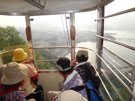 ご褒美はロープウェイ(写真)天上山から3分で湖畔に下りた。