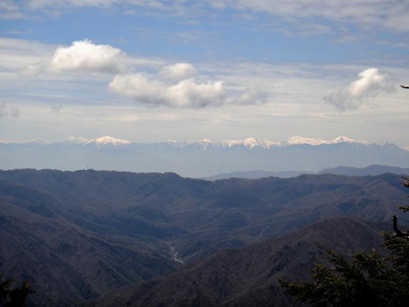 東京に勤務していた20代の頃、休日は山好きな同僚と雲取山や奥多摩の山を良く歩いた。夏の長い連休にはテントを担いで県境の尾根を笠取山まで縦走し、塩山から中央線で甲府に帰った。この2泊3日の計画で中間ポイントに設定していた飛龍山(2069m)のピークを、この時は先を急ぐ余り踏み損ねてしまった。当時は山梨百名山が選定される遥かに昔で、主脈縦走路から外れた眺望の無い山頂の為に費やす時間が惜しかった。あれから35年も過ぎて今日は踏み残した飛龍山の最高点だけを目的に登って来た。今回も同行はY君、年齢は丁度一回り若く、クラブの次期リーダー候補として期待も大きい。コースは丹波山村からサオラ峠経由でミサカ尾根をピストンする片道5時間のロングルートで、特にサオラ峠は別名(竿裏峠)と呼ばれ、立て掛けた竿の裏を登るほどの急勾配の難所とされる。朝のうちは雲が多かったが次第に晴れ間が広がり、前飛龍からは南アルプス(写真)を望む事が出来た。飛龍権現からは僅かに残雪を踏み、開花はまだ先だがアズマシャクナゲの群生地を抜けて、真新しい山梨百名山の標柱が立つ山頂に着いた。下山は東方向に確かな踏み後を見つけ、急降下で程なくして35年前に辿った本線に合流できた。