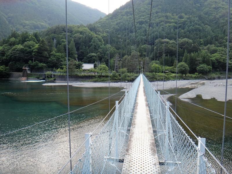 中高年を中心とした登山ブームを受け、山梨県が山梨百名山を選定して今年で20年になる。この間に百名山がある地元自治体や山岳会などは、登り易いルートを新設したり登山道の整備を進めてくれた。その一つ芦川村の滝戸山(1221m)は以前に境川村から登ったが、今日は中道町の右左口(うばぐち)から滝戸川に沿って開かれた標高差700mの新ルートを登ってきた。当初はクラブの4月山行に計画していたが、仕事の都合で延び、5月は2週連続の曇天に泣いた。当然カタクリの群落も花は終わり跡形もないが、やまなしの森林百選に指定される新緑は美しい。同行はいつもハードな山を歩くY君で、お散歩コースに物足りない様子。ならばと下山後にもう一つの新ルート、奈良田湖から笹山(2733m)への標高差1900mのダイレクトルートを下見に行った。この夏に本番を控え、暗い内にスタートして日没間際の下山になるので、奈良田湖の長い吊り橋を渡り(写真)山の神の尾根取り付き点までピストンした。これより先は地図の標記も破線に変わりヘッドランプの明かりだけでは歩けない。体力勝負の厳しい山行になるが、若いもん(Y君40代)に負けじと頑張りたい。右左口08:40~滝戸山10:40 2+00