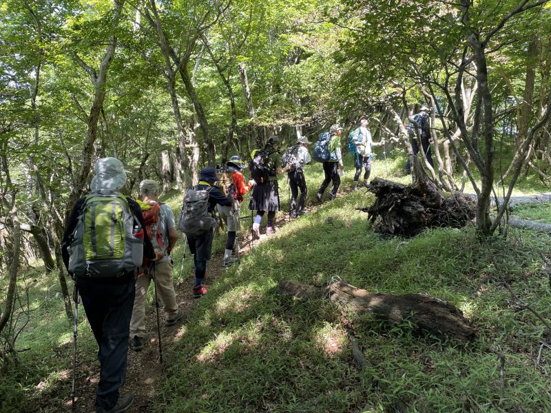 第2回の日向山に続き、第3回登山教室が三方分山で開催された。精進湖の駐車場に集合して準備体操から始まり、初心者向けのハイキング基礎学習がある。総勢28名が3班に分かれスタートする。コースは中道往還を女坂峠へ、峠を左折して三方分山への緑が美しい森を進む。快調に登る2班(写真)。山頂からは南下して精進峠を経由してパノラマ台まで足を延ばす。今日の学習は事前に決められているチェックポントA~Eの区間タイムを地図を読み予測する。最近は道案内をスマホの地図アプリに頼りきっている登山者が多いが、教室の受講者はみな真剣な表情で紙の地図に向き合っていて嬉しい。日向山では地図から標高を読み取る学習だったが、今回は所要時間の計算を実践学習した。その中で難解だったのが距離と標高差だけでは読めないコース上のアップダウンで、予測は大きく外れてしまう。これには受講者のみならずスタッフも一緒に悩んだ。次回はいよいよコンパスの出番だ。SM湖畔駐車場07:30~パノラマ台12:30 5+00