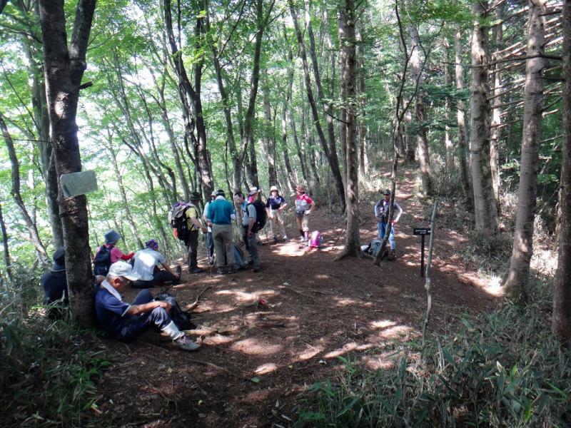 クラブの6月山行に計画していた御正体山(1682m)が天気で順延になり、暑いこの時期に決行となった。御正体山は東西南北から5本のコースがある道志山塊の最高峰(200名山)でグループ登山の利点を活かし、三輪神社で10名を降ろして道坂トンネル西口にマイカー2台を運び、大きな山体を誇る御正体山の約半分を踏破する計画だ。急ぎ神社に戻り予定通り出発する。神社脇からコンクリート舗装の林道を45分も歩かされ、水場になっている小さな沢を渡り山道に入るが、治山工事が山奥まで延びて再び作業道に。やがて尾根を切り崩した真新しく立派な舗装路を横断して、長いアプローチの末に本当の登山道に入る。ここから標高差700m樹林帯の急登が始まる。眺望が無いのは我慢できても、無風で蒸暑い単調な登りは苦行でしかない。それでも誰も文句の一つも無いのは、秋に計画している南アルプスに向けてのトレーニングと承知しての事だろう。暑さ対策に重要な小まめな休憩と水分補給で予定を少し遅れ、独特な雰囲気を放つ山頂に到着した。グループ山行で一番の楽しみはランチタイムだ。今日の目玉はWさん自家栽培の朝取りキュウリにSさん手製の味噌を乗せて振舞われ、暑い夏山で食欲をそそる最高の味を堪能する。帰路は起伏の緩やかな稜線コースを下る。雷雨の心配も無く、心地よい天然クーラーの風が吹きぬける中、メンバーの頬に笑みがこぼれる。山頂から下山40分、白井平分岐点で休憩する参加者13名(写真)元気にロングコースを歩き通した。三輪神社08:25~御正体山12:50 4+25