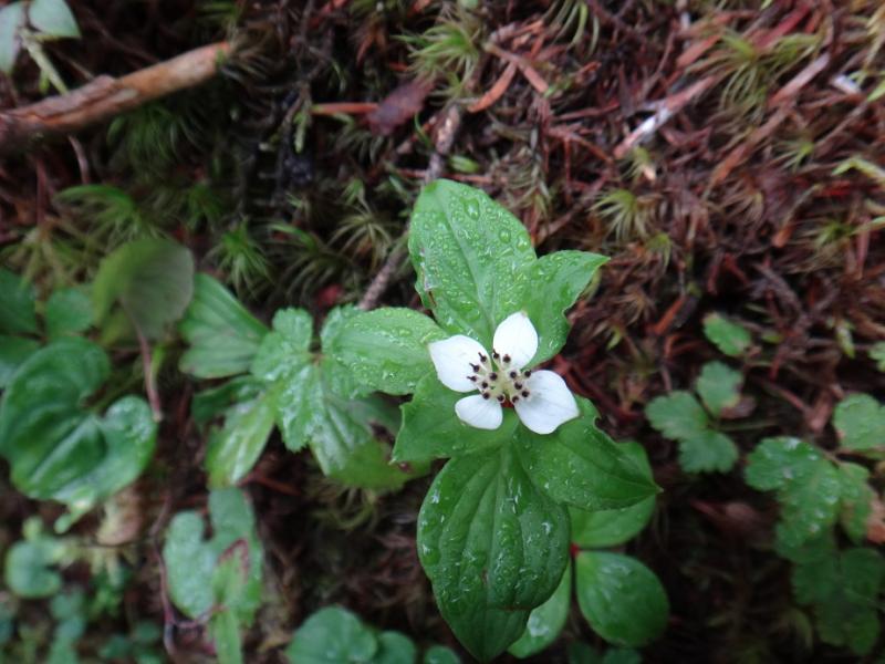 奥秩父連山の最高峰になる北奥千丈岳(2601m)直下の登山道脇にゴゼンタチバナ(写真)が昨夜の雨に濡れしっとりと咲いていた。6時にメンバー10名が集合して車2台で出発、西関東道路が雁坂道に直結したことで90分後には車で登れる日本最高点2360mの大弛峠に到着した。今回は連日の猛暑にお疲れモードのメンバーに、簡単に登れて涼しい高山で英気を養って貰おうと計画した。スタートから15分ほどで夢の庭園に入ると、本来なら見頃のハクサンシャクナゲが今年の異常な暑さに開花期を終えて残念。それでも振り返れば金峰山の五丈岩の背後に八ヶ岳、さらに南アルプス北部の甲斐駒~仙丈~白根三山が見渡せた。心配した暑さもなく木陰に入れば針葉樹林特有の森の香りが心地よい。苦も無く着いた最初のピーク前国師(2570m)は写真だけ撮って通過し、本峰の国師ヶ岳(2592m)ではKさんのオカリナに合わせてクラブソングの大合唱が始まる。北奥千丈に移動して少し早いがお昼にしよう。今回もWさん自家製の朝採りきゅうりを始め、干し柿、オクラ、トマト、ニンニク、梅干、らっきょう等など、各自が持ち寄った自慢の食材が並ぶ。うだる暑さの下界とは無縁の高山では食欲も進む。