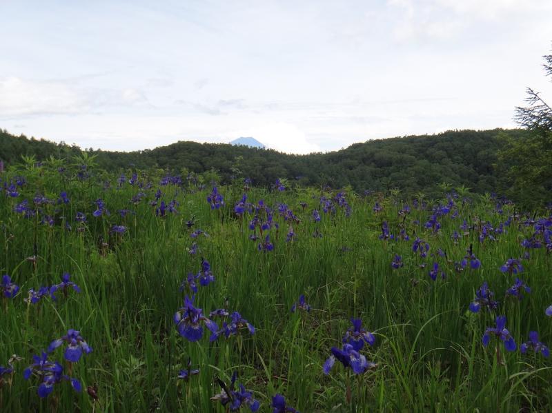 甲府盆地の西に位置する櫛形山(2052m)は代表的なふるさとの山として、また花の百名山として有名である。特に今の時期にアヤメ平に咲くアヤメは東洋一の大群落と賞賛された時代があった。それが地球温暖化による植生の変化や、鹿の食害などによって絶滅寸前にまで減少してしまった。これを何とか復活させようと十数年前から地元の有志などが働き掛けて、柵とネットで保護して再生を見守ってきた。長い時間と大変な労苦だったと思うが、その甲斐があり近年は最盛期の3割ほどの花が戻って来た。そのアヤメの様子を見るため、Y君と初めての南尾根を登った。長引く停滞前線による雨が明け方に上がり、昼頃に晴れの予報がでた。スタートは氷室神社の苔むした急な石段(519段)で始まる。ここが意外な難所で、雨を吸った苔と、硬いビブラムソールの相性は最悪でツルツルと滑る。境内に上がると左手に登山口を示す標柱が立ち山頂まで4時間とある。道は初め谷沿いに登り、途中で右岸に渡って西の尾根に向かって急な等高線を斜めに這い上がる。普段から水量があるこの沢の通過に不安があったが、問題なく丸木橋で渡る。それにしても蒸暑い。大量に水を消費したので、ほこら小屋の水場で水筒を満たす。急な登りから解放され緩やかな稜線を裸山に向かう。山頂からの白根三山は雲に隠れ残念だったが、アヤメの彼方に美しい夏山の富士(写真)が望めた。今回は丸山林道が通行止で、池の茶屋からの入山者が無く、静かな櫛形山が満喫できた。氷室神社09:00~アヤメ平13:15 4+15(裸山経由)