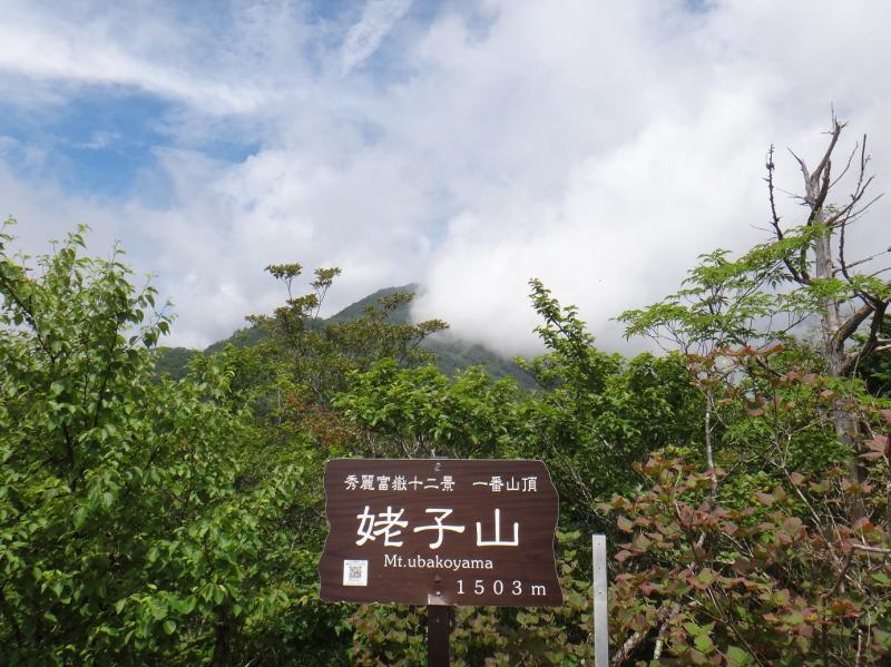台風5号の接近で大荒れが予想され6月27日の北岳草は断念した。仕事と自治会の都合で27日だけのワンチャンスだったが、台風と停滞前線を相手に勝算は薄い。険しい山岳地帯を結ぶスーパー林道は規制雨量で通行止めになり、広河原で足止めを食らう可能性もある。結果は予想進路を大きく東にそれた台風の影響は小さく、特に問題なく登れたようだが、北岳を相手に無謀な賭けを慎む判断は賢明だったと思いたい。それでも目標を失った悔しさは大きく週一のトレーニングにも身が入らない。今日は午前中に時間が空いたので気分転換に大月の姥子山に遠征した。大峠(1560m)の駐車場は県外車が8台と少ない。富士山の眺望はないが、回復傾向の天気に期待してスタートする。40分で誰も居ない雁ヶ腹摺山(1874m)に着く。秀麗富嶽十二景の名山として、五百円札で有名なこの頂上で一人静かに10分休む。この間に困難度★★になる姥子山への初めての道をガイドブックで読む。南東へ尾根を20分下った所で先行する4人組を追い越す。道は部分的に滑りやすい所も有るが明瞭な踏み後とピンクテープで特に問題ない。間もなく金山への分岐を右に見送ると直ぐに舗装された林道を横断する。ここから痩せ尾根を登って西峰へ、さらに東に岩峰の東峰(1503m)に着く。晴れていれば抜群の展望台も周囲は雲に囲まれ、頭上だけに青空が覗く。一瞬の切れ間に帰路は登り返しになる雁ヶ腹摺山(写真)が見えた。晴れた日にまた来よう。大 峠08:50~姥子山10:25 1+35