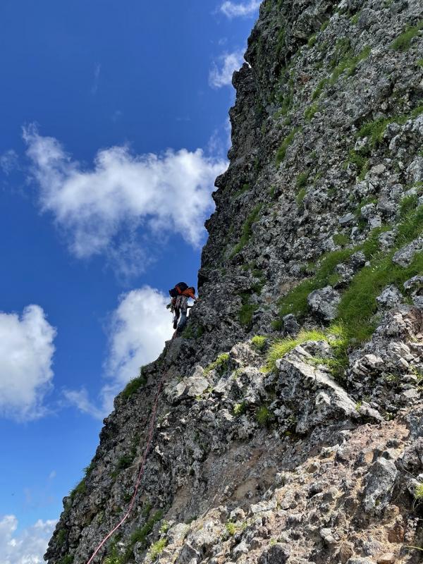 上達に伴ない面白くなってきたスポーツクライミングが、隔週の講習会の合間に有志仲間との自主トレを挟み、気付けば今年から毎週木曜日の日課になっていた。今日はその練習の成果を試そうと八ヶ岳でロッククライミングに挑戦した。40年前に足を洗って、二度と戻らないと思った世界に再び、この歳になって挑む事になるとは何か不思議な因縁のようなものを感じる。厳しい急登のアプローチを頑張り、9:00小同心クラックの取付に着くと先行パーティーがスタートした所で、しばらくの待ち時間となる。ここは周囲を名峰群に囲まれた八ヶ岳連峰のほぼ中心、遠く北アルプスまでの眺望に飽きることはない。この後、装備の点検と登攀の手順を確認していたら上部からラークの声が、直後に拳ほどの落石が空中に跳ね飛ぶ。すみませーん!の声を聞いて、人工壁のジムでは絶対にない落石の怖さに緊張のスイッチが入る。9:46講師S氏のリードで1ピッチ目がスタート(写真)した。青い空に白い雲が風の速さで流れ、これから始まる夢の時間に気分も高揚する。登りだしはウオーミングアップ的な優しい感じだったが、やがて空中に体をせり出す場所や、チムニーに入ったりと変化があり、抜群の高度感と共に約2時間のクライミングを存分に楽しむ事ができた。下山も一般道でなく大同心稜沿いを懸垂下降で基部に戻って総勢5名のクライミングが終了した。途中で雷鳴と一瞬だけパラパラと来たが降られる事なく幸運だった。S氏、H氏と若い二人に感謝したい。美濃戸05:30~取 付09:00 3+30