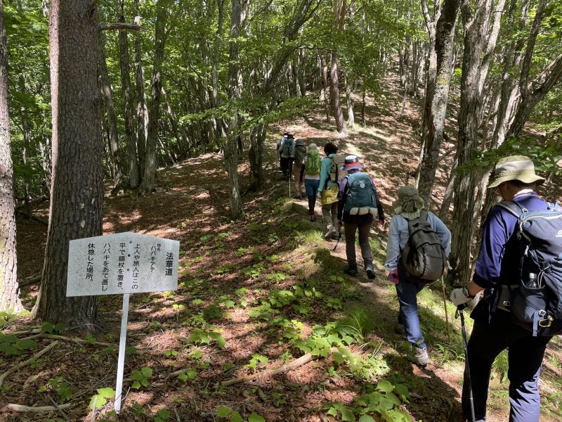 山の会には個性豊かな活動を精力的に行っているメンバーが多い。その一人がO氏(83)普通にピークを目指す登山も熟す傍ら、昔の人が歩いた古道を探索している。晴れた日には現地踏査に出向き、雨が降れば図書館に籠って研究している。今日はO氏の案内で甲斐と伊那谷を結ぶ法華道(ほっけみち)を総勢9名で歩いた。法華道は13世紀後半に日蓮宗僧侶が総本山身延山久遠寺より伊那地方への布教活動に使ったのが始まり。後に武田信玄の騎馬軍団が高遠城を攻める軍事路として、昭和初期までは交易路として多くの人や物が行き交った。今では入笠山から富士見町側の道は消滅し痕跡も見つからないが、高遠側の芝平(しびら)ルートは伊那市によって整備され多くの史跡が復元されている。その一つハバキアテを通過するメンバー(写真)先導するO氏は確かな足取りで、地形図とコンパスは必須、スマホの地図アプリも駆使して道なき道に分け入る姿はカッコいい。SM入笠牧場管理棟10:25~1352m点前12:30 2+05