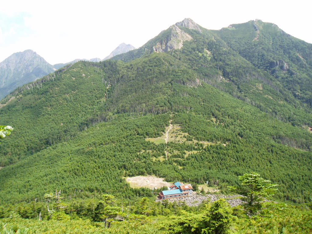長く山に親しんで来ると、誰にも深く胸に刻まれる山ができると思う。僕にとってのそれは迷う事なく八ヶ岳であると言えるだろう。初めて八ヶ岳を訪れてから30年の歳月が過ぎ、夏から冬、新緑の沢登りから新雪のラッセル、仲間達との縦走から初めての単独行、歩き尽くしたすべてのルートに沢山の思い出が有る。写真は、編笠山から青年小屋への降下2510m付近から、正面がギボシで右に権現岳、左後には主峰赤岳の雄姿が、眼下に小屋の青い屋根が見えて来ると、懐かしき青春時代がよみがえる。観音平07:00~編笠山09:45 2+45