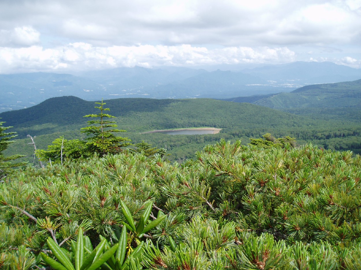 写真の雨池を見下ろす三ツ岳から40分ほど下った地点に、理想的なテラスがあり涼風に吹かれながらビールとランチで至福の時を過ごした。